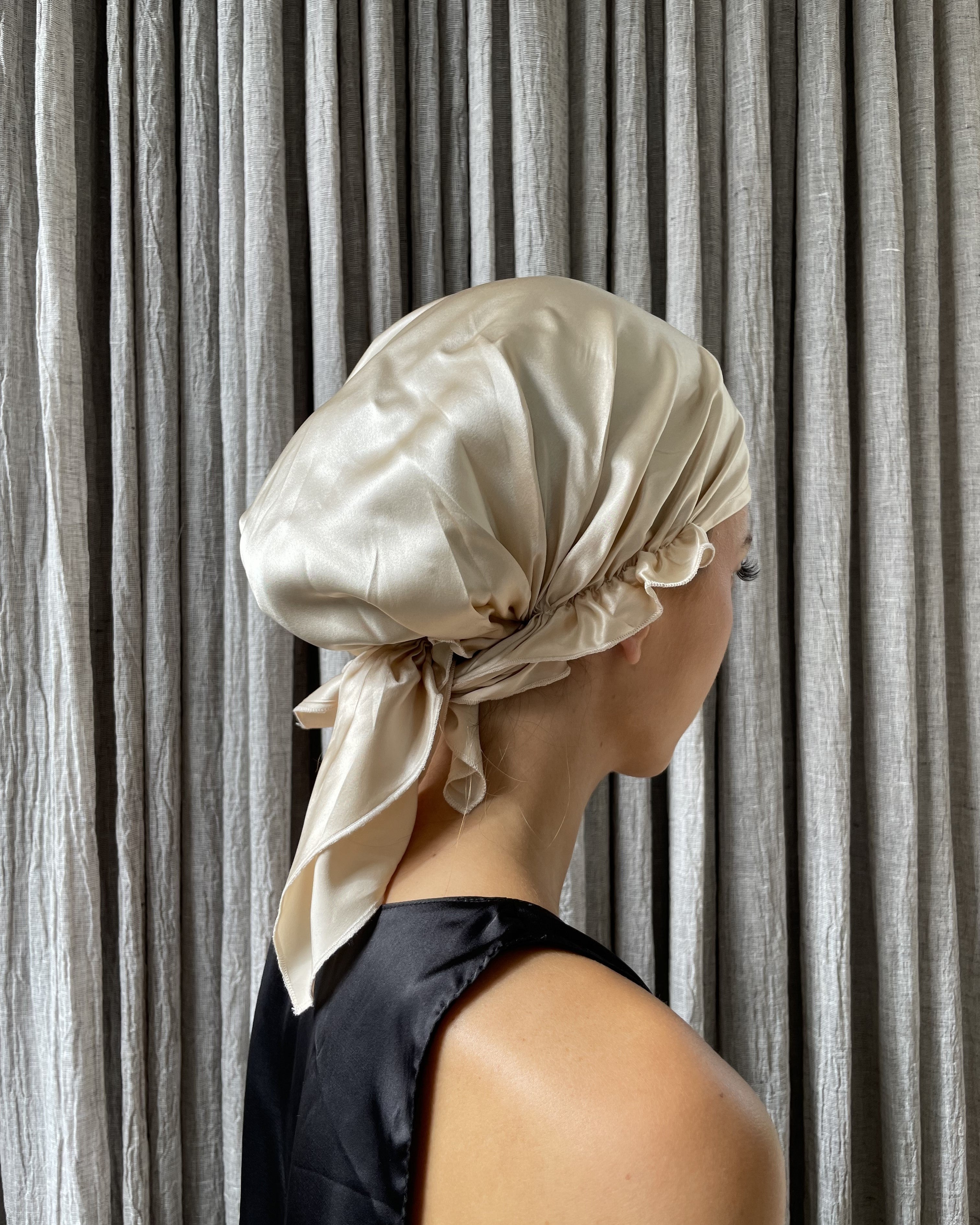 Side ties allow for the bonnet to be tied at the back to adjust fit and hair hold.